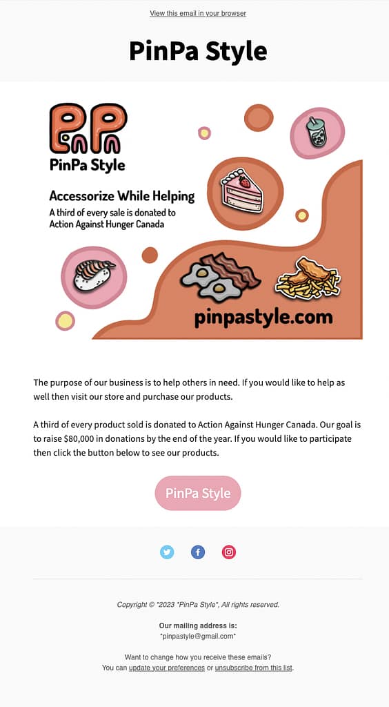 This is an email ad made using Mailchimp that would be sent out for promotion. It simply explains the business and includes an image that presents some of the products.