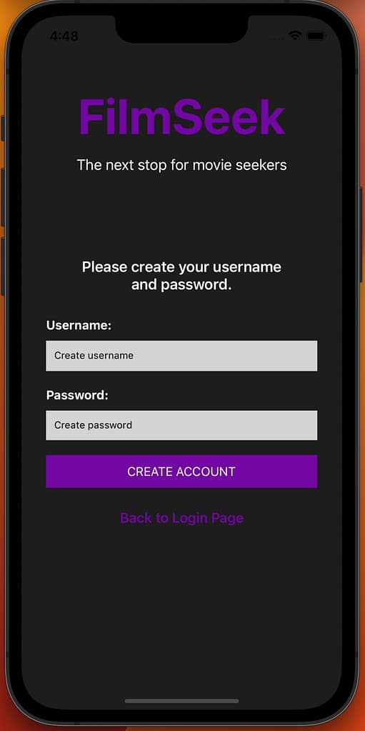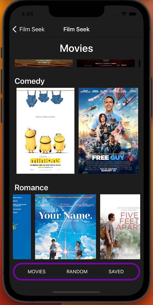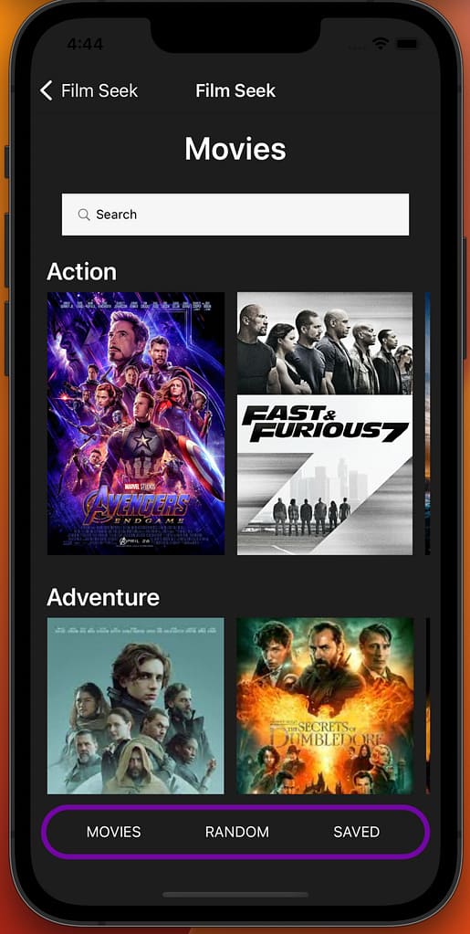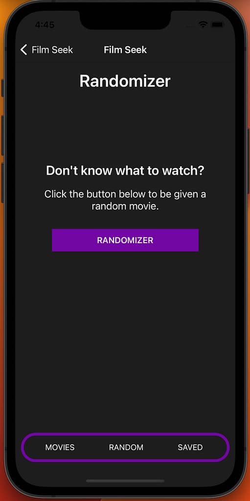 Film Seek is a demo app for users to find movies to watch. I partnered with a classmate, Connor Jack for this school assignment. There is a login and create account page, a movie home page, information pages for each movie, a randomizer, and a saved page.