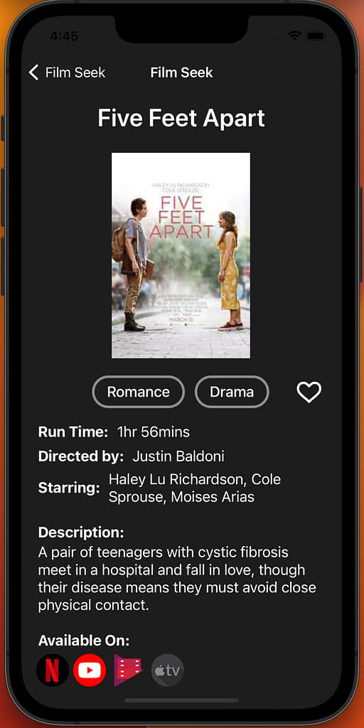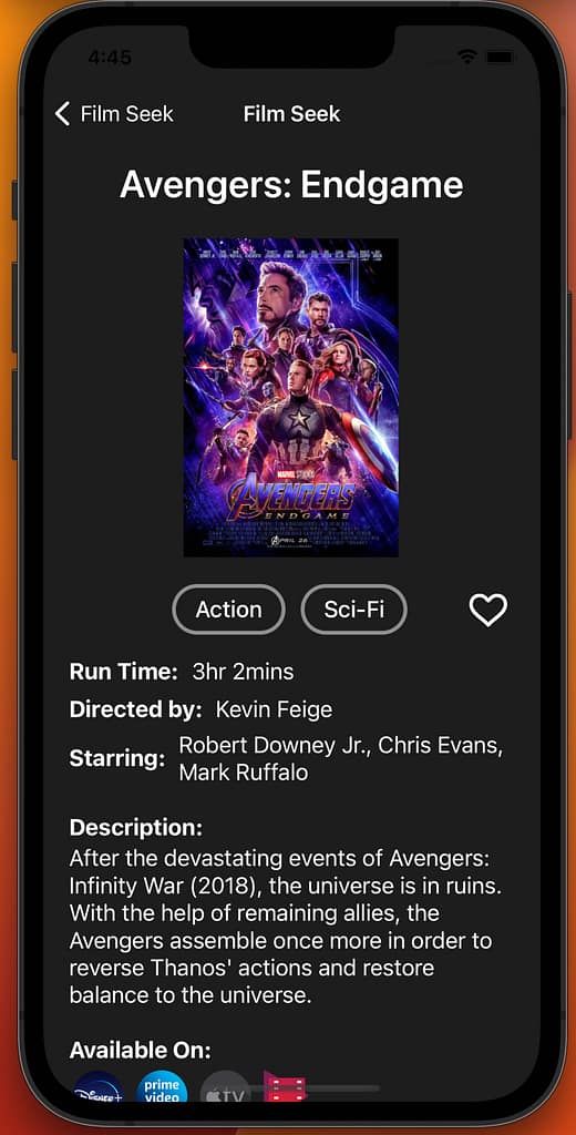 Each movie has its own information page. It includes the title, poster, genre, heart button for the movie to be saved, run time, director, main actors, description, and what platforms it’s available on.